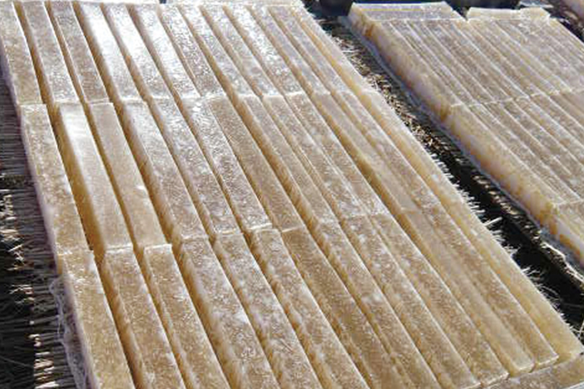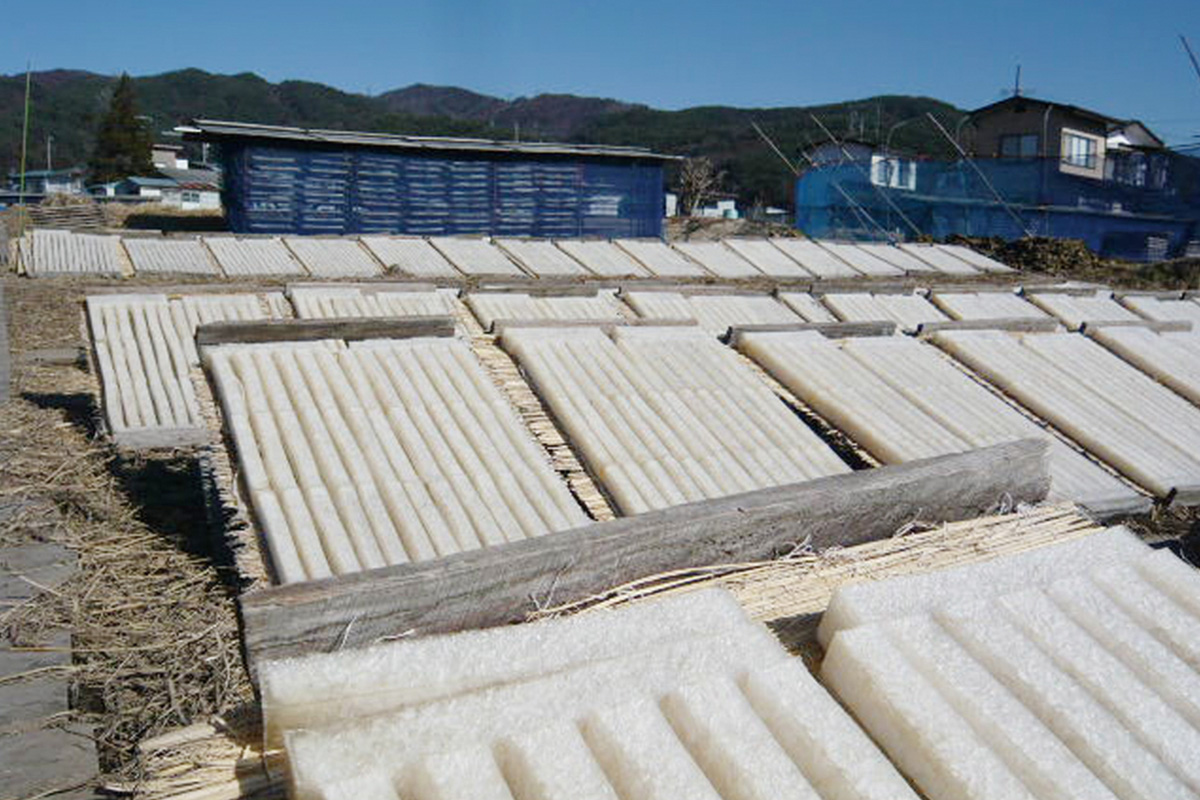 Obwohl Nagano weit vom Meer entfernt liegt, bietet das alpine Klima mit seinen kalten Winternächten, milden Sonnentagen und dem schönen, klaren Wasser und der sauberen Luft die perfekten Bedingungen für die Agar-Produktion. Doch obwohl Nagano seit langem ein Zentrum der Agar-Produktion ist, ist die Zahl der traditionellen Hersteller in den letzten Jahren zurückgegangen, und die meisten Hersteller wenden heute moderne Methoden an und verwenden chemische Zusatzstoffe, um die Produktion zu beschleunigen.
