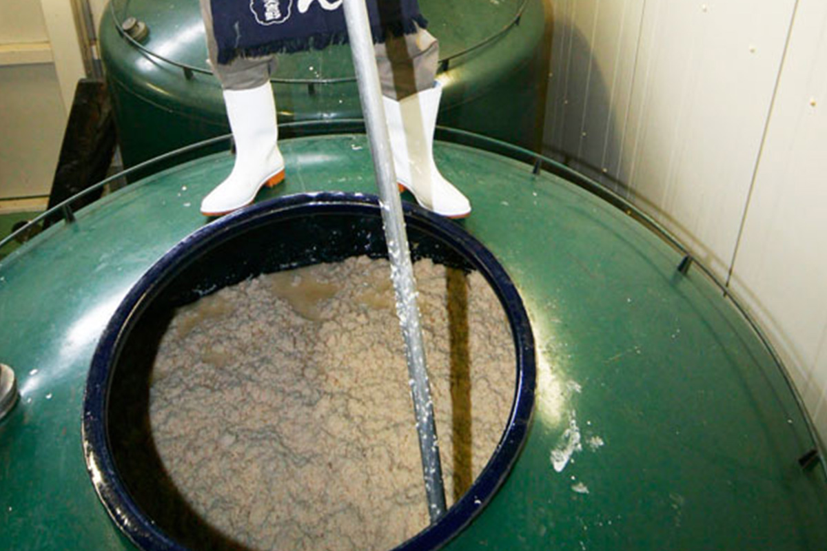 Während die meisten Mirin-Hersteller, früher wie heute, günstigen Shochu verwenden, der aus Melasse destilliert wurde, stellt die Familie Sumiya ihren eigenen Shochu her: Aus handgemachtem Koji, hochwertigem Reis und Quellwasser. Diese Zutaten werden vermischt und etwa einen Monat lang täglich gerührt. Die daraus entstehende alkoholische Maische, genannt Sake Moromi, wird in Baumwollsäcke gefüllt, gepresst, gefiltert und schließlich zu klarem Reis-Shochu destilliert. Damit ist die erste Phase der authentischen Mirin-Herstellung abgeschlossen.