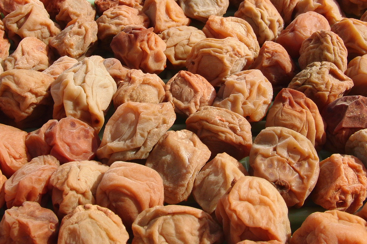„Wenn das Salz in das Fruchtfleisch der Pflaume eindringt, tritt die innere Flüssigkeit, das sogenannte Ume-Su, aus. Der schwere Deckel der Behälter übt Druck auf die dicht gepackte Mischung aus und hält die Pflaumen so in ihrem eigenen Saft. Die Pflaumen bleiben bis Juli in den Behältern. Nach dem Einlegen werden sie herausgenommen und zum Trocknen in die feuchte Sommerhitze gelegt. Dabei werden sie regelmäßig gewendet, um ein gleichmäßiges Trocknen zu gewährleisten. Besonders vorsichtig muss man sein, damit die empfindliche Haut nicht reißt.