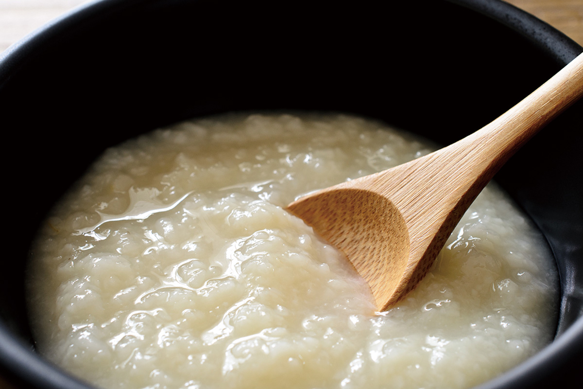 Para el Amazake, prepare primero las gachas de arroz y déjelas enfriar a 50-60 °C. Mezcle el koji de arroz y las gachas y mantenga la temperatura entre 50 y 60 °C al baño María. Remueva de vez en cuando y mantenga caliente durante unas 10 horas hasta que esté listo. Tenga en cuenta que pierde su dulzor cuando la temperatura es demasiado alta y se vuelve ácido cuando la temperatura es demasiado baja. Guarde el amazake terminado en el frigorífico y consúmelo lo antes posible.Cuando se utiliza koji de arroz integral, a diferencia del koji de arroz blanco, tiene salvado en la superficie, por lo que no absorbe la humedad tan fácilmente como el arroz. Por esta razón, es más fácil molerlo en una licuadora antes de añadir agua.