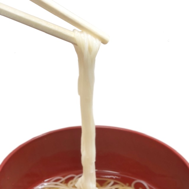 The ingredients are simple, high-protein strong wheat flour, salt and water only. First, the somen dough is made, adjusting the amount of salt depending on the weather and humidity. Respecting hand-stretching methods, the are repeatedly rested and stretched to increase their strength and firmness. This traditional technique produces noodles that are less likely to become soggy when boiled, have a smoother texture, and firmer. -